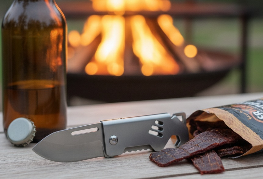 The Master’s Pocket Knife & Opener: A braai master without a blade is like a captain without a compass. This multi-tool is stripped of the “fluff” and focused on the essentials: a razor-sharp folding blade for the biltong and the boerewors, and a reinforced bottle opener that won’t bend or snap under pressure.